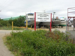 | The cannery itself is on the bank of the Naknek River, along with lots of other companies canneries, like Peter Pan, who Daniel’s boat sells to. We both worked at the main plant, Sue in the “Egg House” processing salmon roe and Corinne in the Cannery running the “lid feed machine”. We stayed in the upstairs of Bunkhouse 88, one of the many packed two story dorms with seemingly hollow wooden floors where you can hear every ones echoing footsteps. Our window looked out onto the entire camp, a much better view than most people had. Here is the sign from the road. |