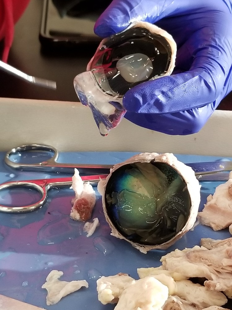 Then Sue went and got a cow eyeball to dissect. Partly for study purposes and partly just to show me. She had to cut away so much fat before we could see the good stuff. Then she sliced it open with a scalpel. It looked like a jellyfish was fighting a mussel. Sue showed me the lens. It was a little clear oblong globe. The second I grabbed it it I squeezed to hard and it shot out of my hands and flew across the room! We acted nonchalant so no one would kick us out.
