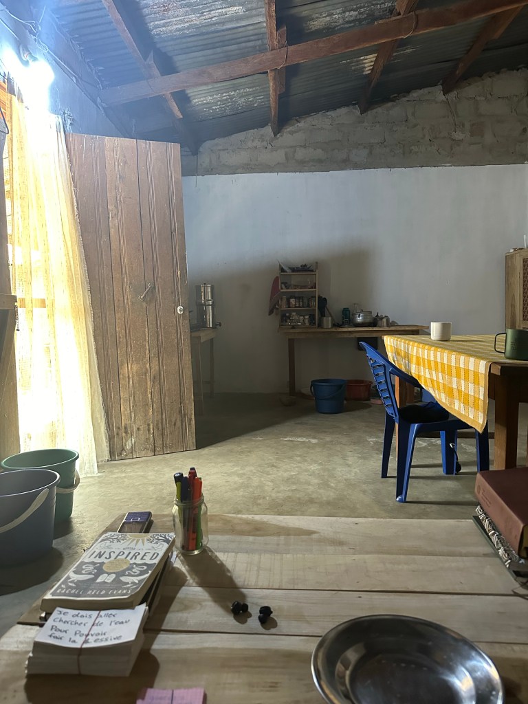 When we first moved here there was nothing in our house but a mattress, a mosquito net, our water filter and our propane stove that sat on a small table. The first piece of furniture we got was a table and two chairs donated to us by the village chief. Then we met with a carpenter here to get a shelf for food, another table and a little spice shelf for the kitchen made. Slowly we’ve been getting more things for the house and now it feels like home.